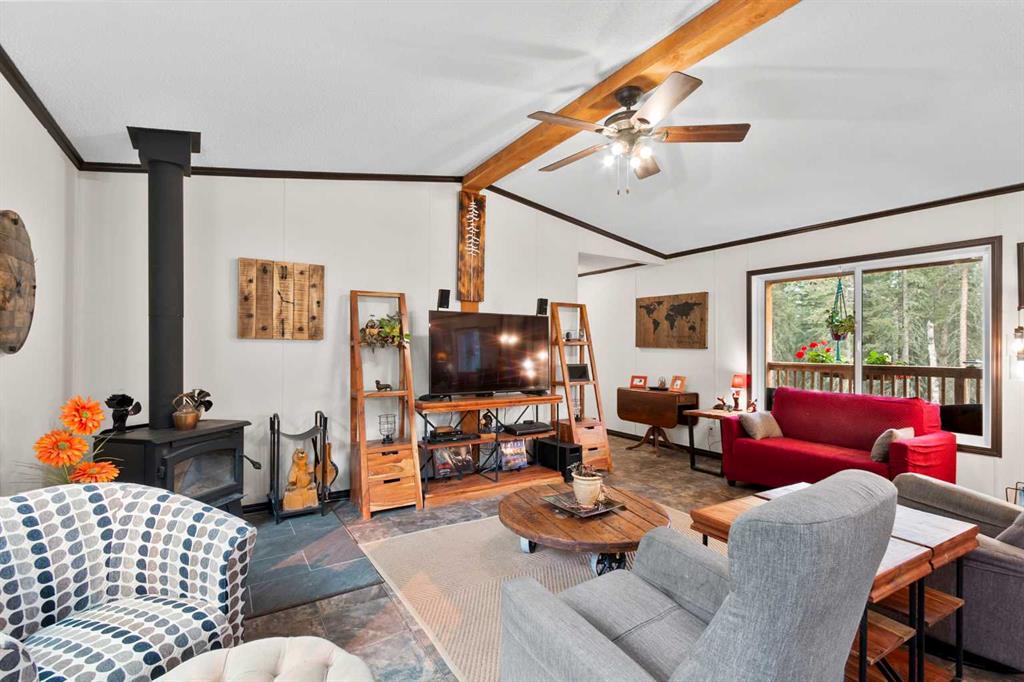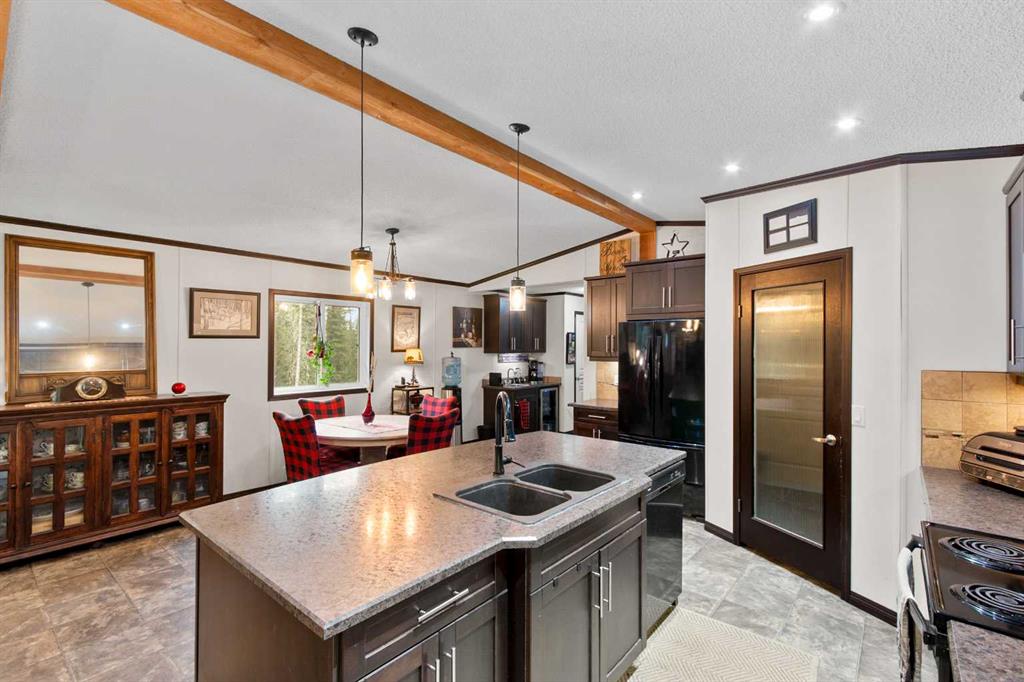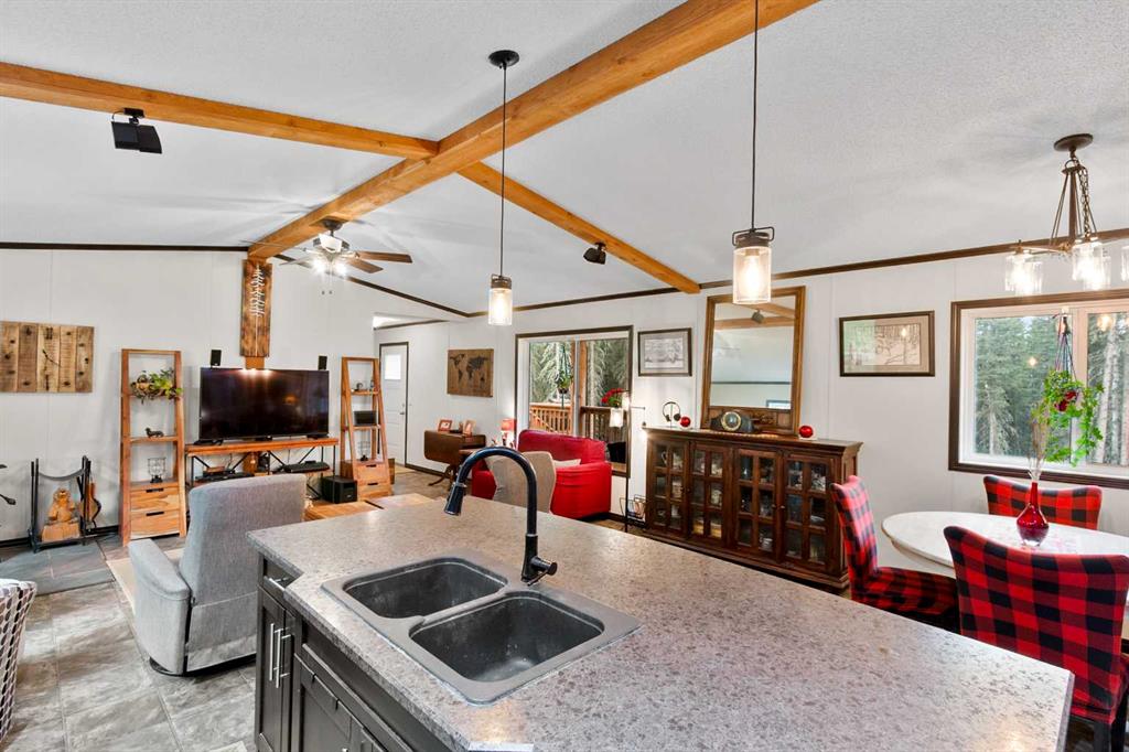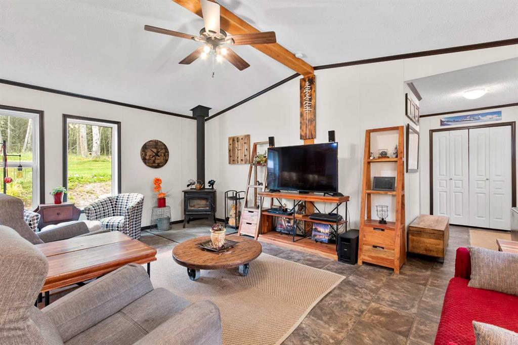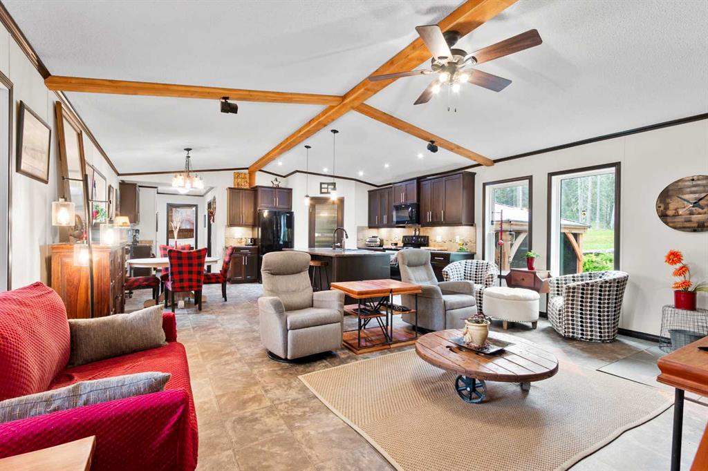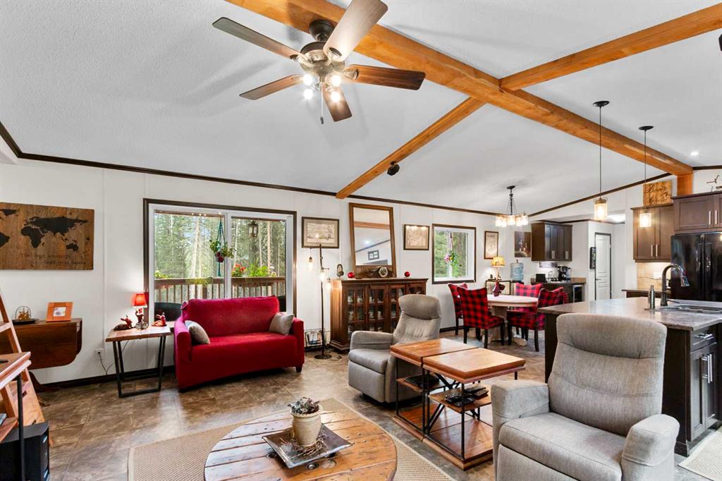 Set on a beautifully TREED SETTING, this 1,472 sq ft modular home offers the space and lifestyle acreage buyers crave. The OPEN-CONCEPT living area is warm and inviting, anchored by a WOOD BURNING FIREPLACE, exposed WOOD BEAMS & room to gather comfortably. A generous dining area flows into the functional kitchen featuring a center ISLAND, a COFFEE BAR and a large WALKTHROUGH PANTRY with convenient access to the laundry room and secondary entry, perfect for country living. The thoughtfully designed floor pla...